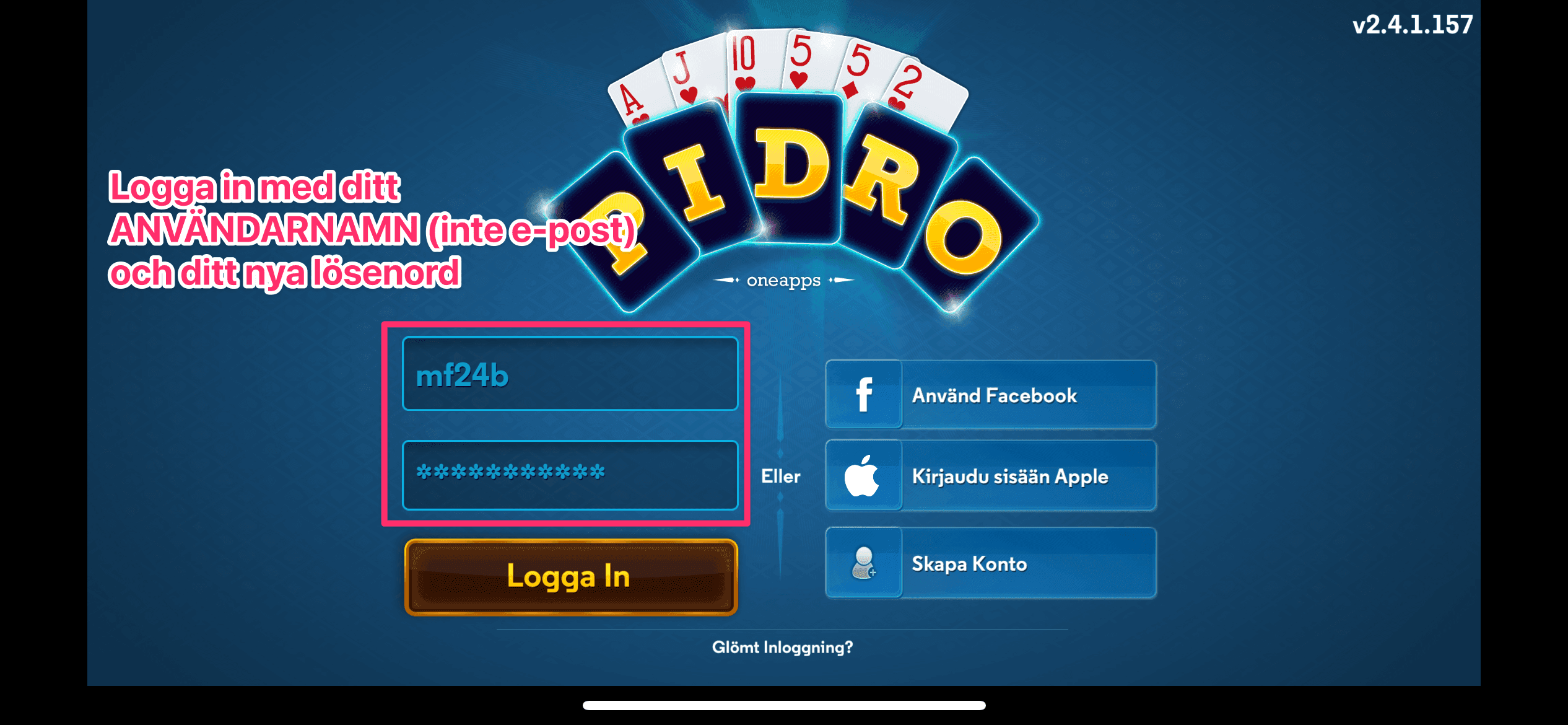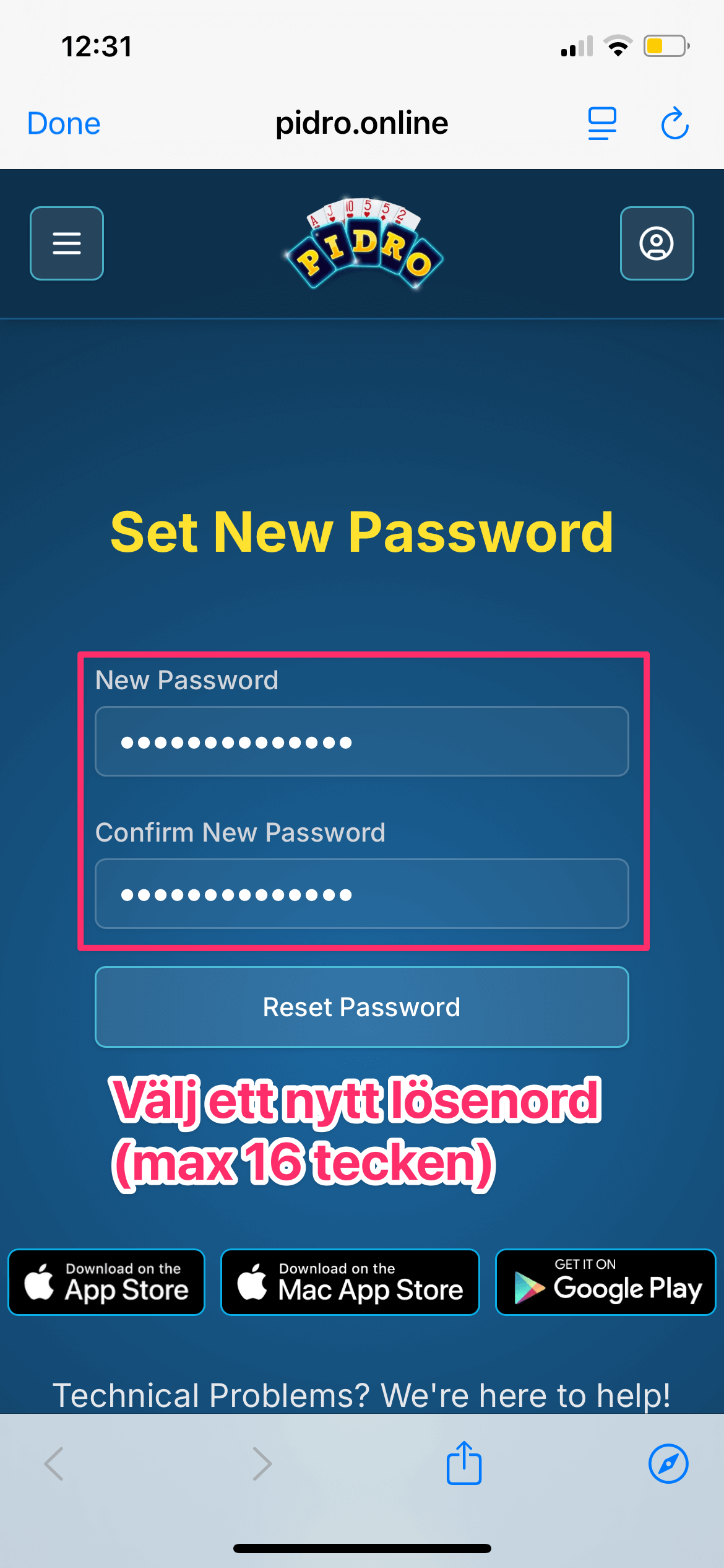 En del webbläsare (Safari, Chrome) föreslår automatiskt jättelånga lösenord. Dessa funkar tyvärr inte i Pidro-appen.